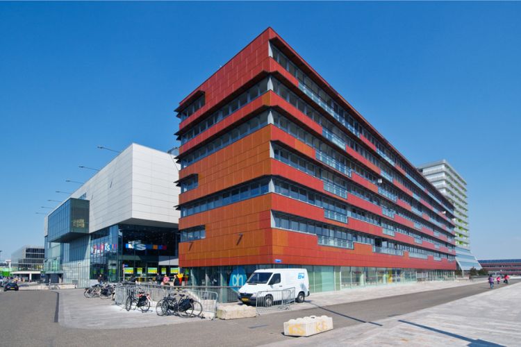 Aan de kant die naar het water gewend ligt, zijn de luiken vervangen door vaste zonwerende gevelpanelen.