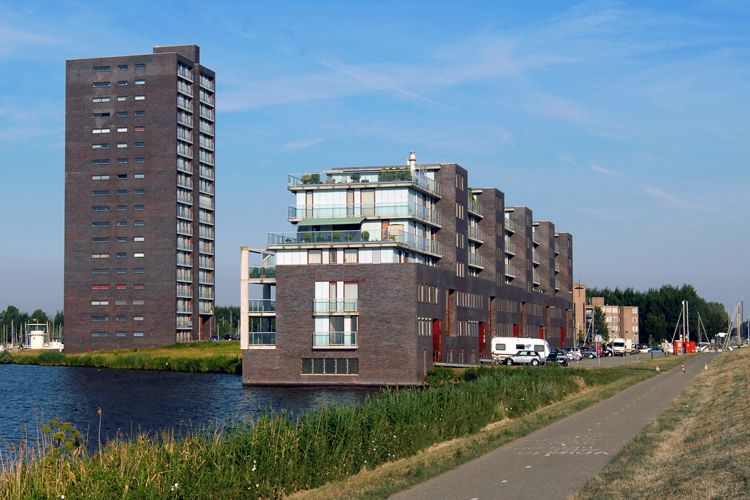 The apartments in the 19-storey block, which closes off the harbour basin, face out in two directions. The horizontally articulated apartments form a rhythmic pattern. The restaurant, built in the same materials, enjoys views across the harbour