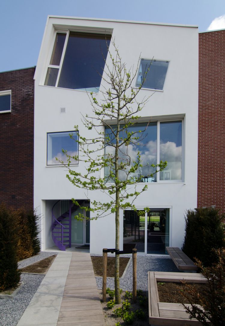 Het scheef geplaatste zolderraam zorgt voor een opvallende aanwezigheid van het huis in het straatbeeld. Hier bevindt zich de slaapruimte met daklichten om sterren en maan te kunnen zien. De vloer daarvan is wel horizontaal geplaatst, wat van buitenaf zichtbaar is. Het kantoor is op de eerste verdieping ingeschoven, met een eigen entree via een spiltrap. Het wonen vindt plaats in de restruimte tussen de dozen. Die ruimte is een route met trappen die spiraalsgewijs omhoog naar boven loopt. Wat gewoonlijk de overlopen zijn, wordt hier getransformeerd tot een reeks ruime plekken, voor hobby's, muziek, tv-kijken of eten. Deze opzet houdt het wonen flexibel en dynamisch. Ook is het huis uitgerust voor nieuwe invullingen die mensen aan het begrip wonen willen geven.