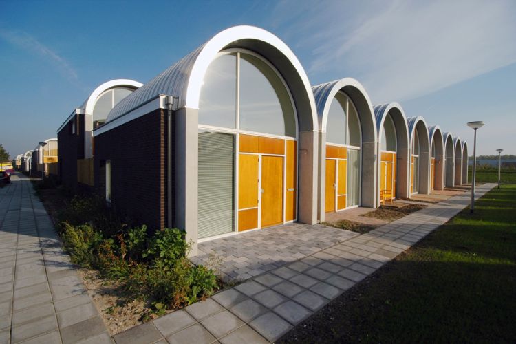 Het project valt op door de originele vormgeving. Op een doos zijn geen puntdaken maar gebogen, glanzende dakvormen