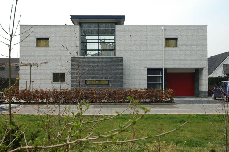 Het woonhuis bestaat uit twee vrij gesloten delen van 2 bouwlagen, gekoppeld door een grote vide. Deze vide heeft glazen wanden en een opgetild dak. Een brug verbindt op de verdieping beide bouwdelen. Aan alle zijden springt het volume van het huis in of buikt het uit. Het licht komt tot midden in de woning en hierdoor wisselt gedurende de dag het karakter van de ruimten. Door de gelede plattegrond ontstaan continue ruimten die elk een specifieke functie hebben, maar toch één geheel vormen. Hierdoor kunnen de bewoners, een echtpaar, altijd contact met elkaar hebben. De gevels van grijze beronsteen hebben aan de straatzijde diep terugliggende kleine ramen, aan de tuinkant zijn gehele vlakken van glas voorzien, zodat de relatie met de op het huis geënte strak aangelegde tuin optimaal is. De ramen zijn aan de zijkant van de gevelwanden gelegd, zodat er veel muur overblijft voor de kunstwerken.